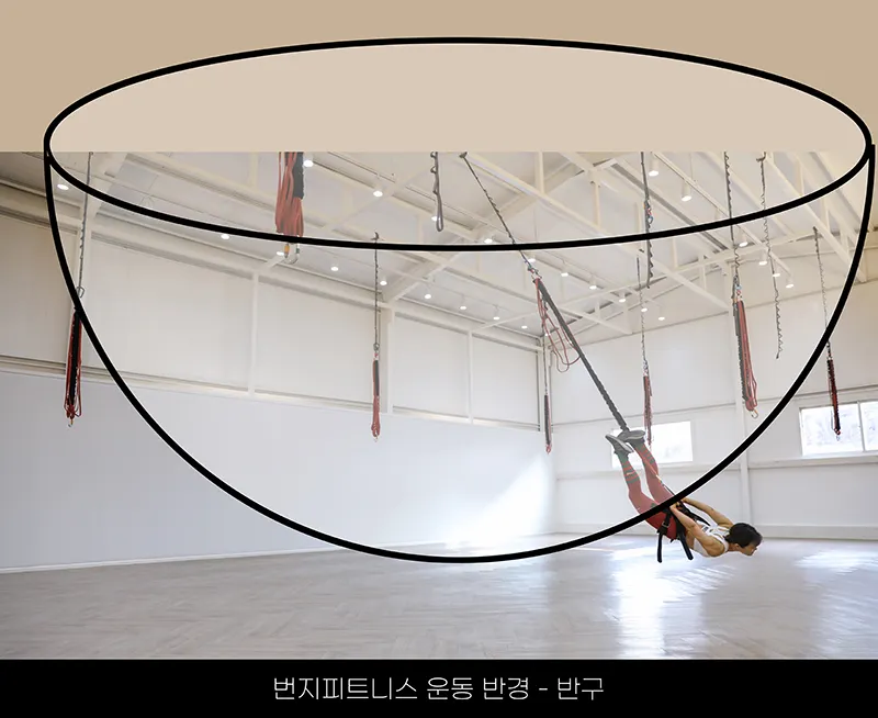 번지피트니스의 운동 반경은 반구 형태의 3D회전 운동입니다.